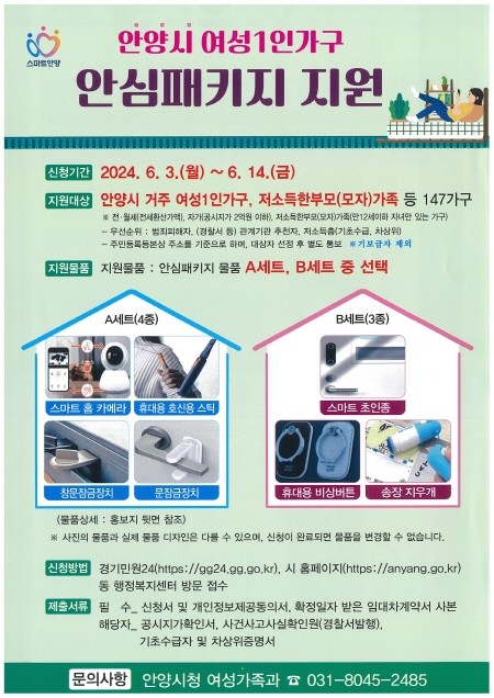 [프레스뉴스] 장현준 기자= 안양시는 여성 1인 가구의 안전한 일상을 돕기 위한 ‘여성 1인 가구 안심패키지 지원사업’을 실시하고 오는 14일까지 신청자를 모집한다고 3일 밝혔다.