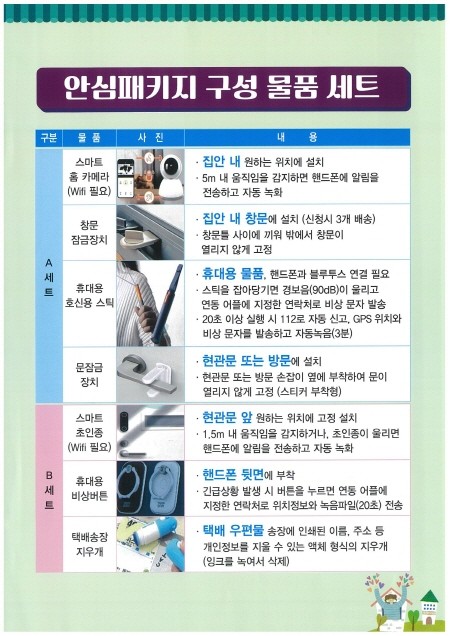 안심패키지 지원물품은 ▲(A세트, 구성품 4종) 스마트 홈 카메라, 창문 잠금장치, 호신용 스틱, 문 잠금장치 ▲(B세트, 구성품 3종) 스마트 초인종, 휴대용 비상버튼, 택배 송장 지우개 등이다. 대상자가 이 중 1개 세트를 선택할 수 있다.