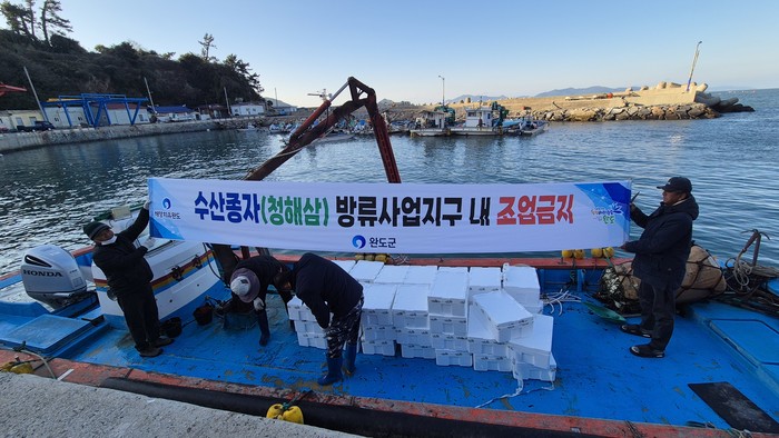 | ▲해삼 방류 후 사업지구 내 조업 금지 현수막 게시(사진제공=완도군) |