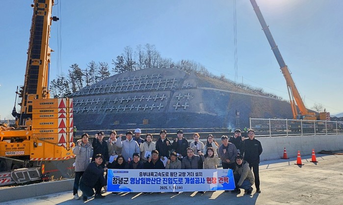 이번 교육은 영남일반산업단지 진입도로 개설공사 현장에서 중부내륙고속도로 횡단 교량(L=45m) 거더 설치 작업을 참관하는 방식으로 진행됐다.
