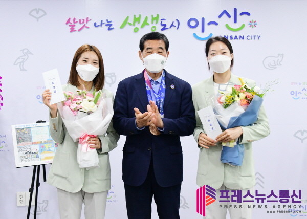 | ▲시청에서 열린 ‘2020 도쿄 올림픽’ 동메달 봉납식(왼쪽부터 최수연 선수, 윤화섭 시장, 서지연 선수)2021.81.11 사진=안산시 |
