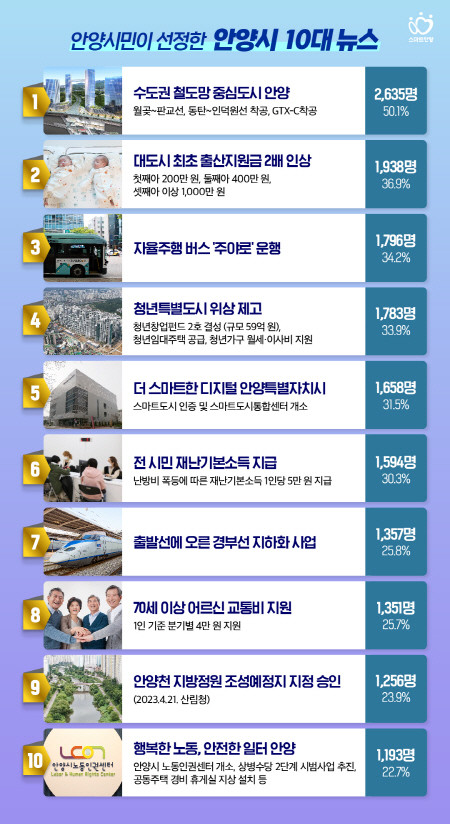 8위는 70세 이상 어르신 교통비 지원(1,351명), 9위는 안양천 지방정원 조성예정지 지정 승인(1,256명), 10위는 행복한 노동, 안전한 일터 안양(1,193명)이었다.