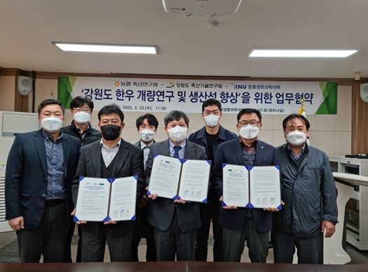 [프레스뉴스] 장현준 기자= 강원도축산기술연구소는 3월 23일 강원대학교 동물생명과학대, 농협 경제지주 축산연구원과 함께 강원한우 개량연구 및 생산성 향상을 위한 업무협약을 체결하였다.