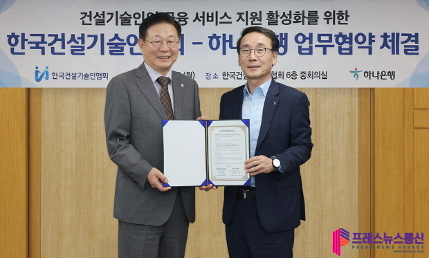 [프레스뉴스] 류현주 기자= 하나은행(은행장 이승열)은 지난 20일 오후 한국건설기술인협회(회장 윤영구)와 업무협약을 체결하고, 한국건설기술인협회 소속 건설기술인들과의 동반성장을 위한 금융 지원에 나선다고 밝혔다.
