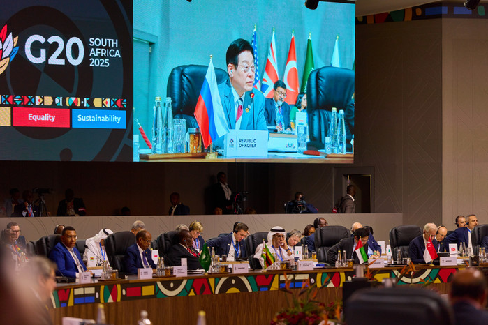 | ▲ 이재명 대통령이 22일(현지시간) 남아프리카공화국 요하네스버그 엑스포 센터에서 열린 G20 정상회의 제1세션에서 발언하고 있다. /사진=이재명 대통령 SNS |