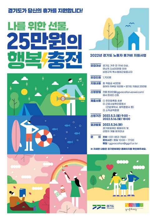시행 3년 차를 맞는 이 사업은 도내 비정규직·특수형태근로 종사자 등 휴가 여건이 상대적으로 열악한 취약 노동자에게 문화생활 향유와 여가활동을 지원하고자 경기도가 2020년 도입했다.
