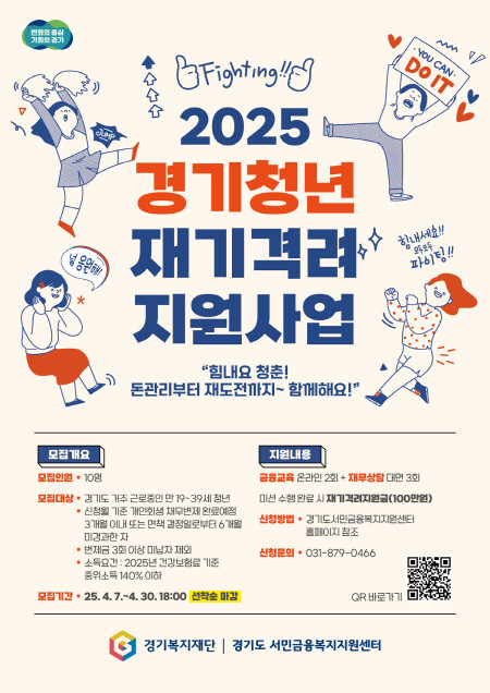 [프레스뉴스] 장현준 기자= 경기도는 경제적 어려움 속에서도 채무를 성실히 상환하고, 재도전을 준비하는 청년에게 격려금 100만 원을 지급하는 ‘2025년 경기청년 재기격려지원사업’을 올해 새롭게 추진한다며, 참여자 10명을 4월 30일까지 선착순으로 모집한다.