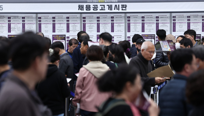 | ▲ 경기도 고양시 킨텍스에서 열린 2025 고양시 중장년 일자리 박람회에서 구직자들이 채용 정보를 살펴보고 있다./사진-뉴스1 |