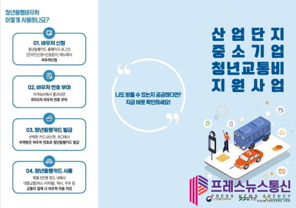 교통 여건이 열악한 산단 내 중소기업에 재직 중인 만 15~34세 청년에게 지하철, 시외·고속버스, 택시, 전기차 충전 등에 사용할 수 있는 월 5만 원의 교통비 바우처를 지원하고 있다.