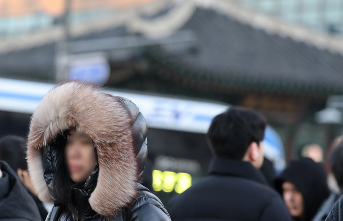 | ▲칼바람 속 영하권 날씨를 보인 28일 오전 서울 광화문 네거리에서 한 여성이 모자를 덮어쓴 채 출근길 발걸음을 재촉하고 있다. /사진=뉴스1 |