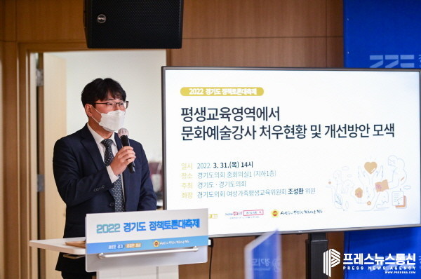 [프레스뉴스] 김대일 기자= 경기도의회와 경기도가 공동으로 주최하는 「2022 경기도 정책토론대축제」의 일환으로 ‘‘평생교육영역에서 문화예술강사 처우현황 및 개선방안 모색’을 위한 정책토론회가 경기도의회 중회의실에서 31일(목)에 개최되었다.