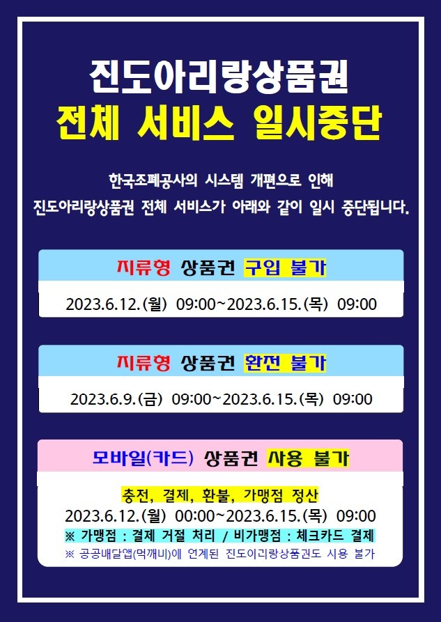 [전남=프레스뉴스] 신상균 기자= 전남 진도군이 발행한 진도아리랑상품권이 오는 12일 0시부터 15일 오전 9시까지 사용이 일시 중단된다.