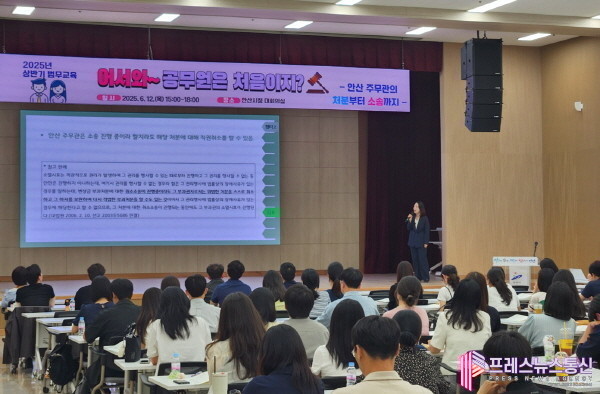 [프레스뉴스] 장현준 기자= 안산시(시장 이민근)는 지난 12일 안산시청 대회의실에서 2023년 이후 임용된 공무원 및 공직자를 대상으로 법무교육 ‘어서와~ 공무원은 처음이지?’ 프로그램을 진행했다고 13일 밝혔다.