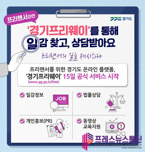 [프레스뉴스] 장현준 기자= 프리랜서를 위한 일감정보는 물론 개인 홍보, 법률상담 기능까지 갖춘 경기도의 온라인 플랫폼 ‘경기프리웨이’가 15일 공식 서비스를 시작했다.
