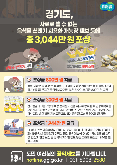 | ▲ 경기도, 사료로 쓸 수 없는 음식물 쓰레기 사용한 개농장 제보 등에 총 3,044만 원 포상 그래픽자료(사진=경기도) |