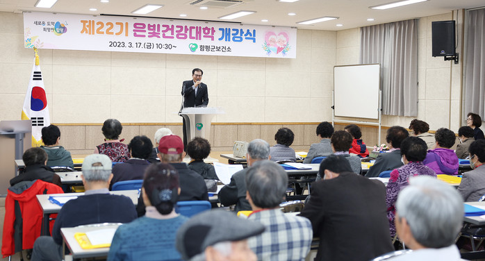 21일 함평군에 따르면 제22기 은빛건강대학이 어르신 60여 명이 참석한 가운데 지난 17일 보건소 통합관리센터에서 개강했다.