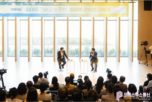 | ▲지난달 31일 오후 봉하마을을 방문한 김동연 경기도지사가 특별대담 '김대중 그리고 노무현, 미래를 준비한 대통령' 에 참석하여 대담을 하고 있다.(사진=경기도) |