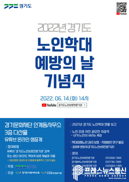 한편 도는 노인학대 예방의 날을 맞아 14일 경기문화재단 다산홀에서 노인학대 예방의 날(6월 15일) 기념행사를 개최한다. 도가 주최하고 경기도사회서비스원(노인보호전문기관) 주관으로 진행될 이번 행사는 경기도노인보호전문기관 유튜브 채널을 통해 온라인 생중계된다.