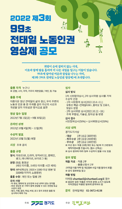 먼저 올해 3회째를 맞는 ‘99초 전태일 노동인권 영상제’는 99%의 사람들을 위해 살아간 전태일의 정신을 기리는 영상작품 공모전으로, 7월 1일부터 9월 30일까지 작품 공모를 진행한다.