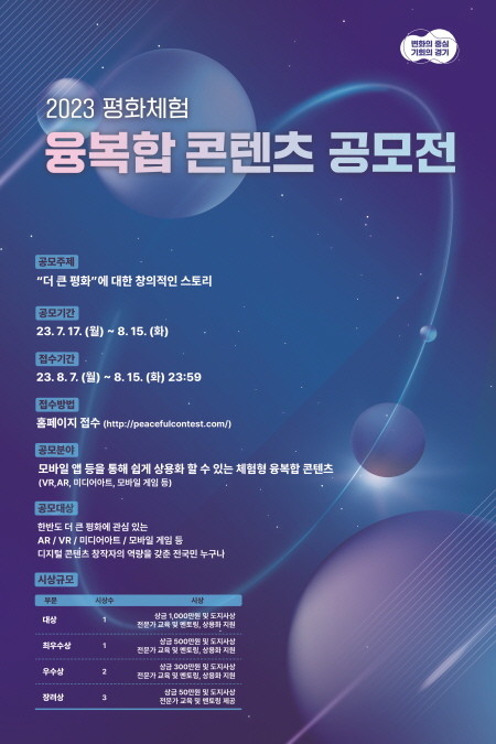 공모전은 평화 분위기 확산과 디엠지(DMZ) 일원 홍보를 위해 ‘더 큰 평화’와 관련된 창의적인 스토리를 기반으로 한 모바일 융복합 체험형 콘텐츠 발굴 목적으로 마련됐다.