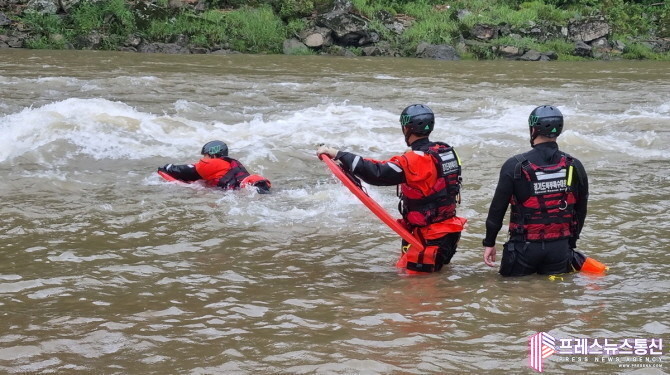 [프레스뉴스] 김대일 기자= 경기도북부특수대응단은 지난 11일 포천시 영북면 화적연 계곡에서 급류 사고 대비 인명구조 훈련을 실시했다.