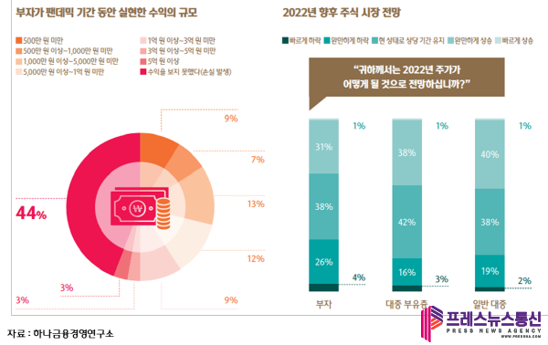 | ▲ 부자가 팬데믹 기간 동안 실현한 수익의규모, 2022년 향후 주식 시장 전망 그래픽(사진=하나금융경영연구소) |