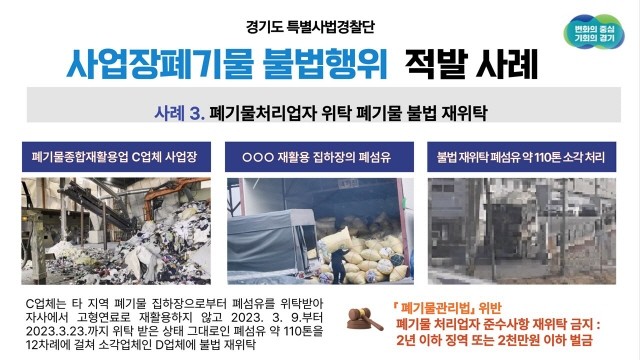 C 폐기물 재활용업체는 타지역 폐기물 집하장으로부터 폐섬유를 위탁받아 연간 3억 4천500만 원에 재활용하는 것으로 계약을 체결했으나, 지난 3월 위탁받은 폐섬유 110톤을 총 12회에 걸쳐 자사 사업장에서 재활용 처리하지 않은 상태 그대로 D업체에 재위탁해 적발됐다.