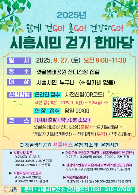 [프레스뉴스] 장현준 기자= 시흥시(시장 임병택)는 시민의 건강한 생활 습관 확산과 활기찬 지역 공동체 조성을 위해 오는 9월 27일 오전 9시, 갯골생태공원 잔디광장에서 ‘2025년 제3회 시흥시민 걷기 한마당’을 개최한다.