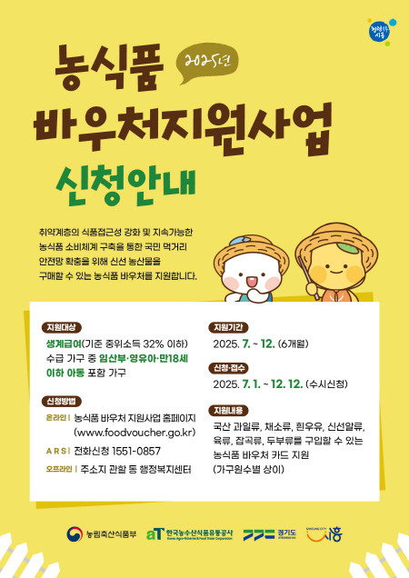 신청 기간은 7월 1일부터 12월 12일까지이며, 주소지 관할 동 행정복지센터를 방문하거나 온라인(www.foodvoucher.go.kr) 또는 ARS(1551-0857)를 통해 신청할 수 있다. 단, 대리신청, 외국인 가구원이 포함된 가구는 관련 증빙서류를 지참해 방문 신청해야 한다.