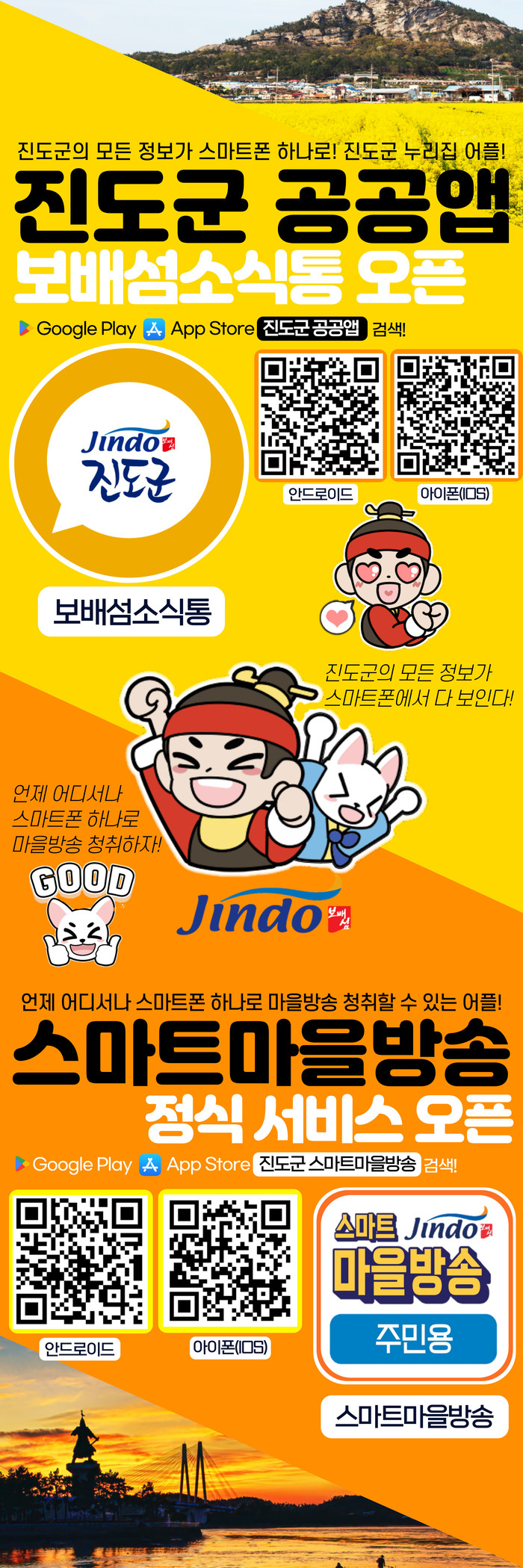 구글플레이어와 애플스토어에서 ‘진도군 공공앱(보배섬 소식통)’과 ‘스마트마을방송’을 검색해 앱을 다운로드하면 누구나 이용이 가능하다.