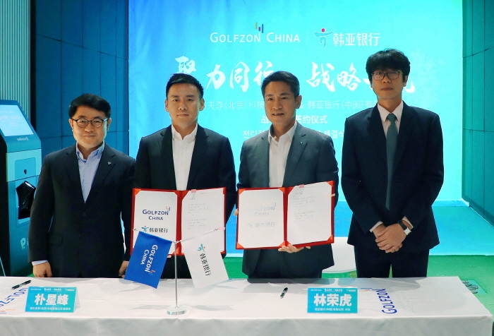 | ▲ 하나은행 중국유한공사는 지난 11일 중국 북경 골프존차이나 본사에서 골프존차이나와 중국 현지 가맹점 지원을 위한 업무협약을 체결했다고 밝혔다. 업무 협약식에 참석한 임영호 하나은행 중국유한공사 법인장(사진 왼쪽에서 세 번째)과 박성봉 골프존차이나 대표이사(사진 왼쪽에서 두 번째)가 기념촬영을 하고 있다. |