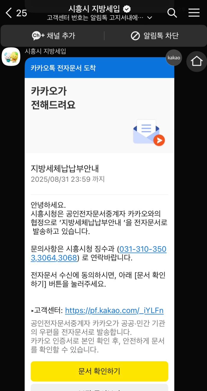 ▲모바일(카카오톡) 전자문서로 발송된 지방세체납납부안내 화 면(사진=시흥시 |