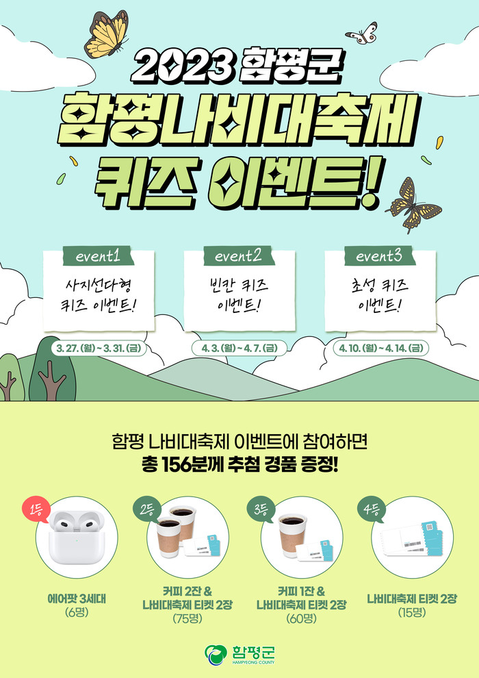이벤트에 참여하기 위해선 ▲나비대축제 퀴즈 풀기 ▲함평군 유튜브 및 (재)함평축제관광재단 유튜브 팔로우 하기 ▲네이버 폼에 퀴즈 정답 및 구독 인증샷 제출하기 ▲응원 댓글과 이벤트 공유하기 등을 하면 된다.