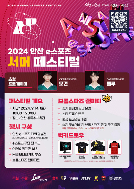 ‘e스포츠 메카’로 도약하는 안산시(시장 이민근)는 모두가 함께하고 즐기는 청년축제 ‘2024 안산 e스포츠 서머 페스티벌’을 오는 14일 안산 상록수체육관에서 개최한다고 9일 밝혔다.