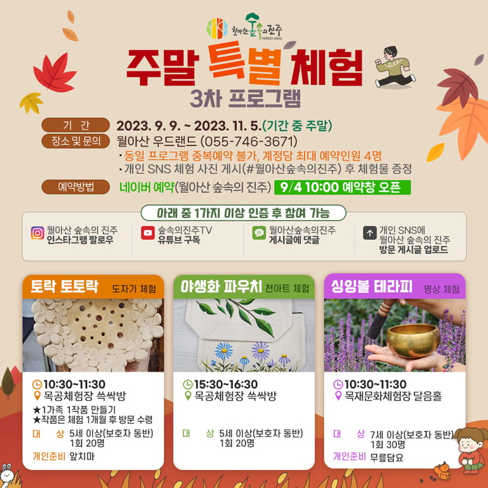 시 관계자는 “월아산 숲속의 진주에서 운영되는 상시프로그램과 더불어 주말 특별체험 프로그램에 많은 관심을 보여 줘 감사하다”며 “3차 프로그램은 유아부터 성인, 가족이 함께할 수 있는 오감, 예술, 치유 프로그램으로 구성했다. 예약 시 참여 조건을 잘 참고하여 예약신청하기 바란다”고 말했다.