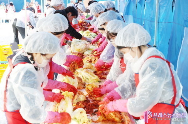 25일 안양시에 따르면, 김장나눔에는 추운 날씨에도 불구하고 최대호 안양시장과 안양시 노인종합복지관 직원, 자원봉사자 등 50여 명이 참여해 김장김치 총 3,000kg을 직접 담갔다.