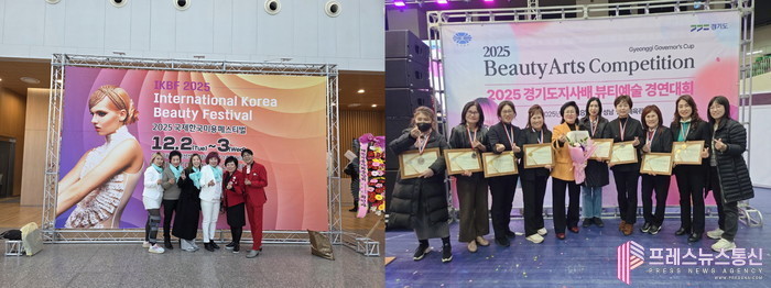 | ▲2025 국제한국미용페스티벌(왼쪽 사진)과 2025 경기도지사배 뷰티예술 경연대회(오른쪽 사진) 수상자들이 기념촬영을 하고 있다.(사진=안산시) |