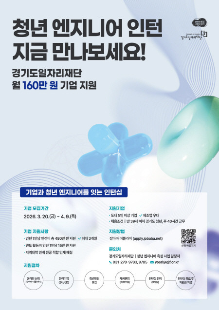 [프레스뉴스] 강보선 기자= 경기도일자리재단이 ‘청년 엔지니어 육성사업 : 지역 청년 채용연계형 인턴십’ 참여기업을 4월 9일까지 모집한다. 도내 기업과 청년을 연계해 실무 중심 인턴십을 지원하는 사업이다. 최근 ‘경력직 같은 신입’을 선호하는 채용 흐름에 대응해 현장 중심 인재 양성과 기업의 채용 수요 연계를 위해 추진한다.