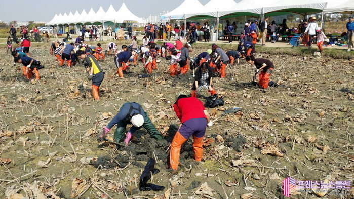 ▲지난 2023년 가족과 함께하는 호조벌 연근 캐기 행사 현장(사진=시흥시) |