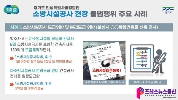 주요 사례를 보면 화성시 소재 복합건축물 신축공사현장 발주자 ‘A’는 소방시설공사업자가 아닌 종합건설사 ‘B’에게 소방공사를 포함한 건축공사 전체를 150억 원에 도급계약해 소방시설공사 도급위반과 분리도급 위반으로 적발됐다.