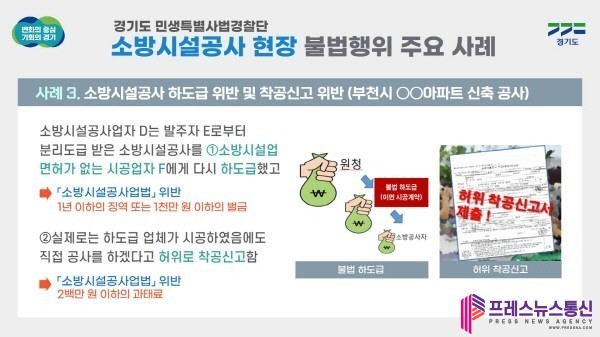 [프레스뉴스] 장현준 기자= 대형 공사장에서 불법하도급 등 소방시설공사 관련 불법행위를 저지른 공사 현장 관계자들이 경기도 특별사법경찰단에 무더기로 적발됐다.
