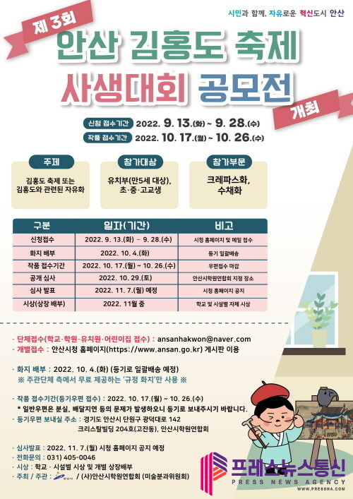 [프레스뉴스] 장현준 기자= 안산시(시장 이민근)는 안산 출신 천재화가 김홍도를 주제로 만5세 이상 유치원생 및 초·중·고교생을 대상으로 한 ‘제3회 김홍도 사생대회 공모전’을 개최한다고 13일 밝혔다.