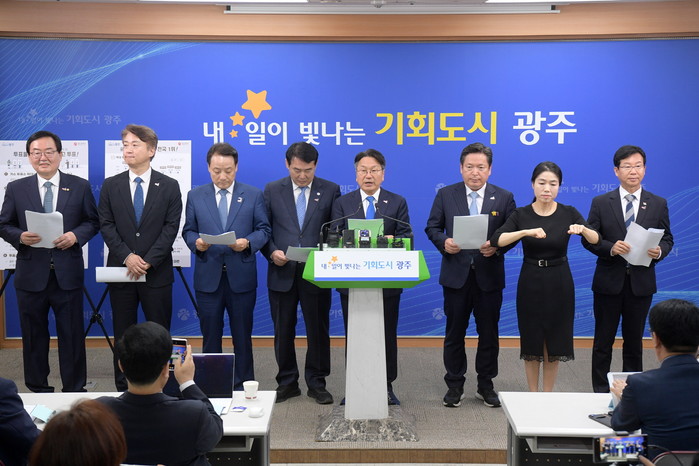 이날 기자회견에는 강기정 광주시장을 비롯해 이정선 광주시교육감, 임택 동구청장, 김이강 서구청장, 김병내 남구청장, 문인 북구청장, 박병규 광산구청장이 참석했다.