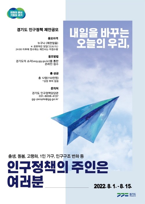 류인권 경기도 기획조정실장은 “인구 위기의 심각성을 공유하고 대안을 찾고자 인구정책토론회에 이어 정책 제안 공모를 실시한다”며 “인구정책의 주인인 여러분께서 미래를 바꾸는 현재의 정책을 찾아주시기를 바란다”고 말했다.