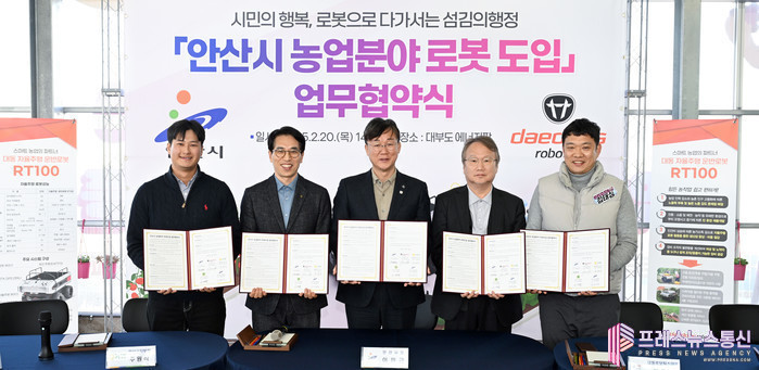 안산시(시장 이민근)는 지난 20일 대부도 에너지 팜에서 대동로보틱스, 농협중앙회 안산시지부, 안산시 4-H 연합회, 안산시주민자치협의회와 함께 농업 분야 로봇 도입을 위한 업무협약을 체결했다고 21일 밝혔다.