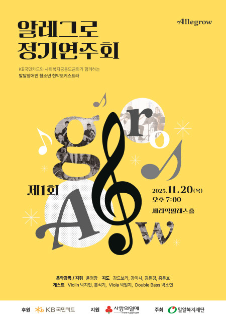 한편, KB 알레그로는 KB국민카드가 사회복지법인 밀알복지재단과 함께 올해 새롭게 후원하고 있는 발달장애 청소년 음악교육 지원사업이다. 전문가의 1:1 개인레슨, 전체합주, 마스터클래스, 여름캠프 등 프로그램을 통해 체계적인 음악교육을 지원한다. ‘AlleGrow’는 음악 용어 Allegro(빠르고 경쾌한)에 Grow(성장하다)를 더해 만들어졌다. 음악으로 청소년의 건강한 성장을 희망하는 ‘쾌활하게, 발랄하게, 빠르게!’의 의미를 담았다.