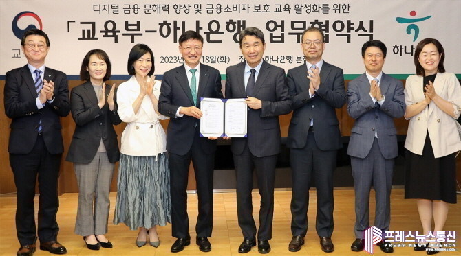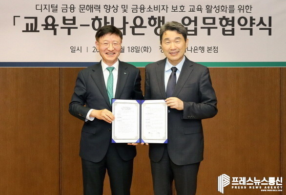 [프레스뉴스] 김대일 기자= 하나은행(은행장 이승열)은 디지털 금융거래 확산으로 금융서비스에서 소외되고 있는 금융소비자들을 보호하기 위해 교육부(사회부총리 겸 교육부 장관 이주호)와 ‘디지털 금융 문해력 향상 및 금융소비자 보호 교육 활성화’를 위한 업무협약을 체결했다고 밝혔다.