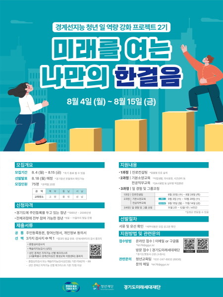 참여 신청은 경기청년포털(youth.gg.go.kr) 내 서식을 내려받아 작성한 후, 담당자 전자우편(kh76@ggyc.kr)이나 구글폼으로 제출하면 된다. 최종 합격자는 오는 18일 경기청년포털을 통해 발표될 예정이다.