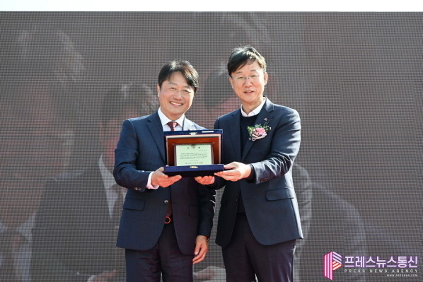 | ▲ 이민근 안산시장(오른쪽)이 지난 29일 윤동열 안산대학교 총장(왼쪽)으로부터 감사패를 전달받고 함께 기념촬영을 하고 있다.(사진=안산시) |