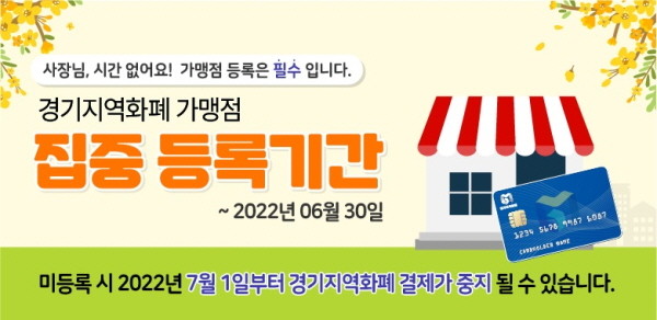 김상수 경기도 지역금융과장은 “경기지역화폐 가맹점 등록신청은 공정한 지역화폐 유통과 효율적인 가맹점 관리를 위한 필수 절차”라며 “지역화폐 결제 제한 등 불편 방지를 위해 꼭 기한 내 가맹점 등록신청을 완료할 수 있도록 협조해달라”고 당부했다.